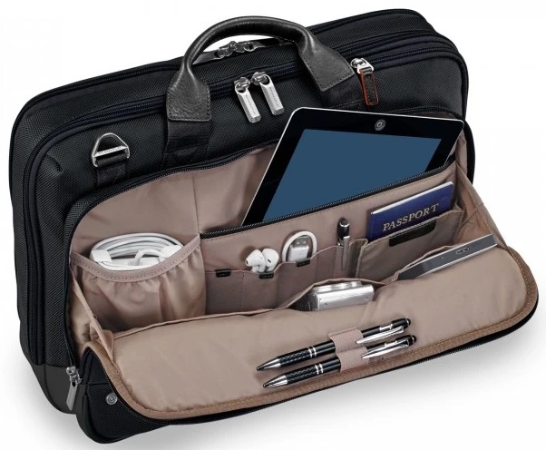 - Briggs and Riley 1680 denier ballistic nylon is water repellent and resistant to abrasions, color fading and soiling; Top-grain leather touch points
