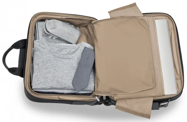 - U-zip panel in laptop compartment reveals a large section that can accommodate clothing and other bulky or odd-shaped items such as shoes, and this section can also be laid flat to pack like a traditional suitcase.
