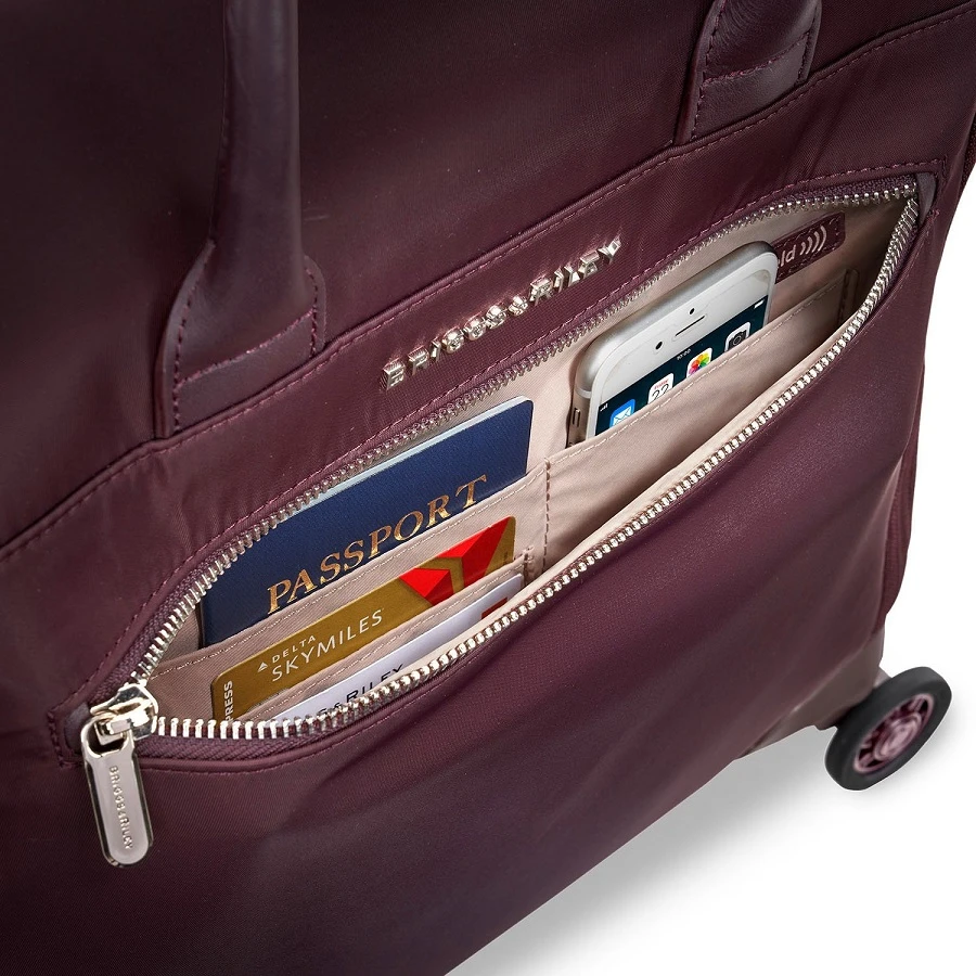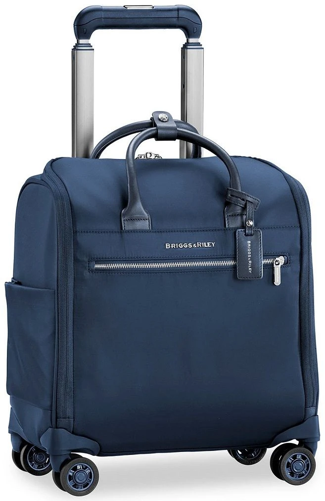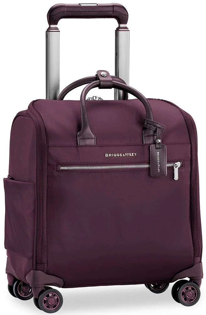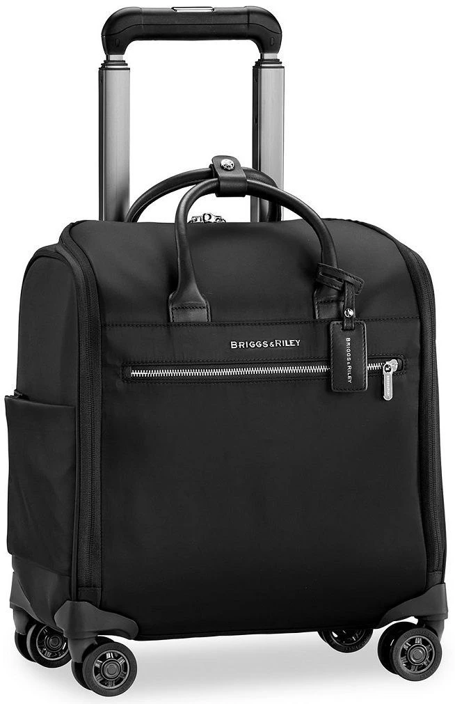Fashion that rolls is the Briggs & Riley Rhapsody widemouth cabin spinner briefcase! Made of micro-weave nylon, it is resistant to abrasions, tears, moisture and dirt! With napa leather trim, the Briggs & Riley Rhapsody widemouth cabin spinner brief is elegant and functional. Fabulous and functional pockets give you a place for everything, and it also has an RFID blocking pocket to protect your passport and credit cards from radio frequency ID theft. Double swivel spinner wheels allow you to roll in any direction and even down the aisle of planes and trains conveniently. Roll the Briggs & riley Rhapsody widemouth cabin spinner easily on the dual wheels or carry it by the double handles or secure it to the trolley handle of your rolling luggage! With the Guaranteed for Life warranty from Briggs & Riley, you don’t need to worry! We include FREE shipping and a FREE leather tag monogrammed with your initials for easy identification of your Briggs & Riley Rhapsody cabin bag briefcase spinner!