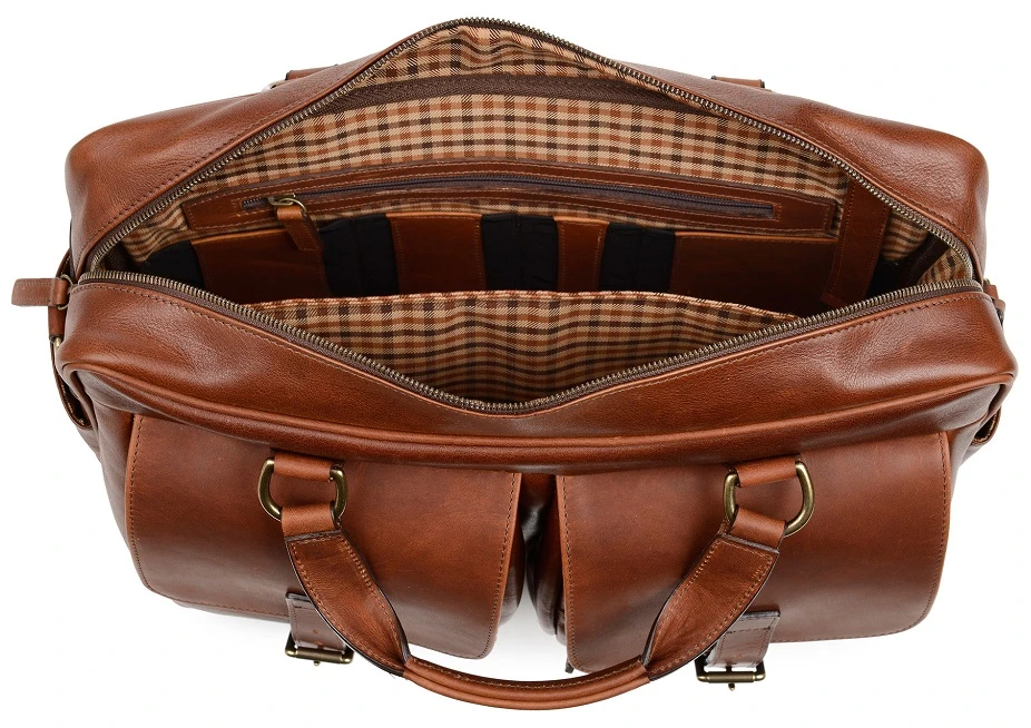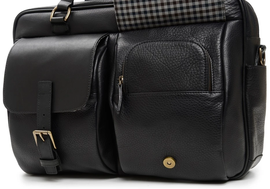 - 2 accessory pockets covered by full grain leather flaps