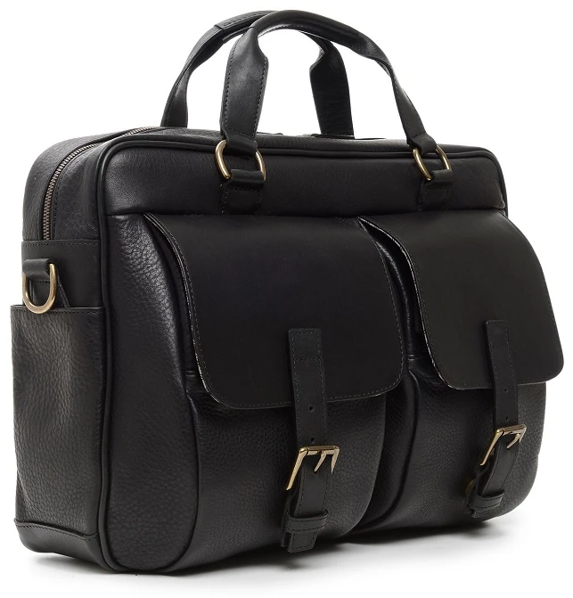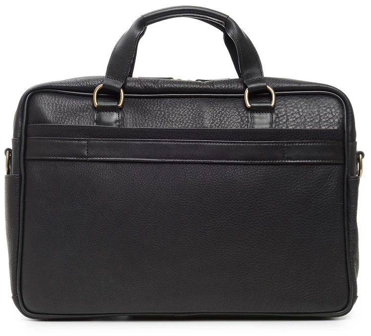 - Korchmar, Full grain American pebbled leather trimmed with oil tanned saddle leather