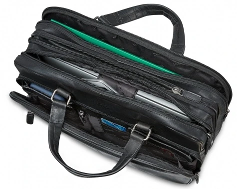 Modern with dedicated compartments and pockets, the Mancini buffalo leather double compartment expandable laptop briefcase insures that you are always efficient and well prepared. Made of luxurious top grain buffalo leather, it has double carry handles, a removable adjustable shoulder strap, and an attach-a-bag strap in the back so you can slip it securely over the trolley handle of your rolling luggage! This Mancini buffalo leather double compartment expandable laptop briefcase has an RFID pocket to protect your credit cards and passport from radio frequency ID theft. This is the well designed for you! We include FREE shipping and a FREE leather tag monogrammed with your initials so everyone knows this handsome Mancini Buffalo leather double compartment expandable laptop briefcase is yours!