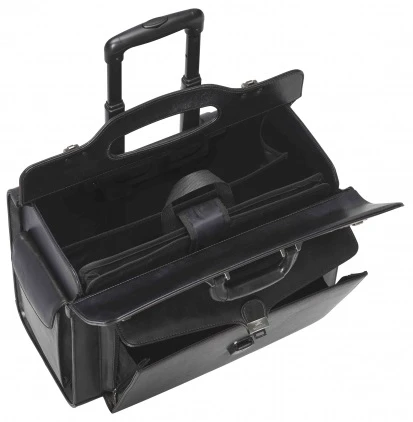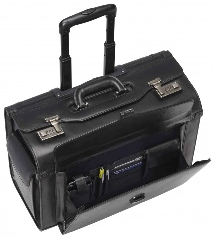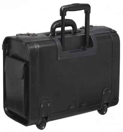 - Mancini full-grain, vegetable-tanned, leather wheeled catalog case