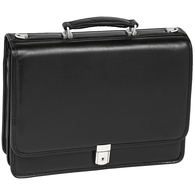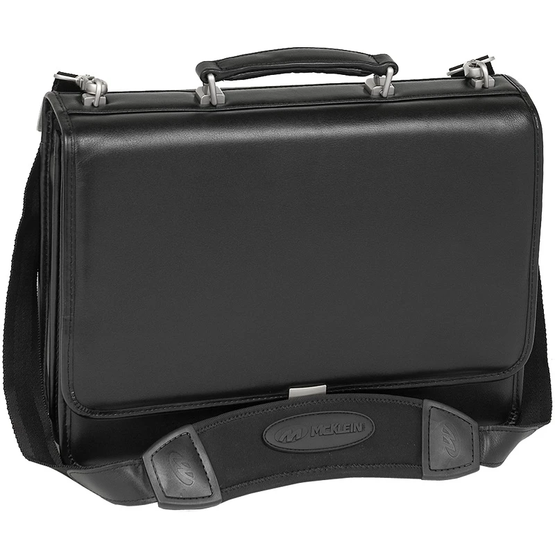 Traditonal and elegant, the McKlein leather flapover triple gusset brief is designed to be efficient and functional. It can be carried by businessmen or women. It has a key lock and will hold laptops up to 15.6″ in size. Full grain cashmere napa leather is true luxury and great value! Conveniently carry this McKlein leather briefcase by the top handle, the removable adjustable shoulder strap, or slip it over the trolley handle of your rolling luggage. It will piggyback on top securely. Shipping is FREE and we include a FREE leather baggage tag with your monogram!