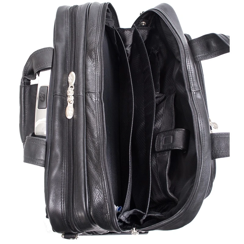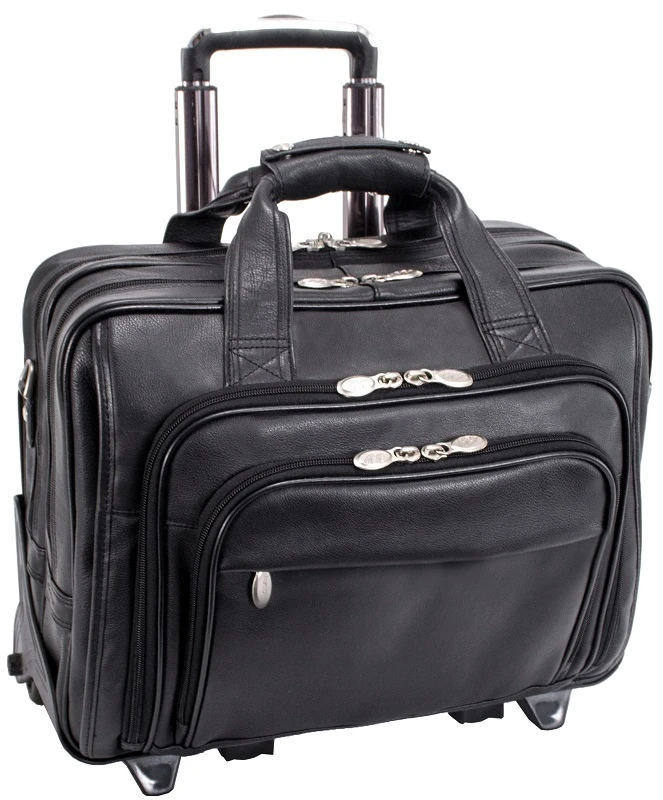 McKlein 1 Series Gold Coast 17″ Detachable wheeled leather briefcase offers great value with our low SALE prices. Shipping is FREE of charge. This is an innovative style designed for both men and women executives. This McKlein leather rolling brief has removable wheels. These wheeled briefcases can be carried by the top handles, the removable and very comfortable shoulder strap, or wheeled to your destination. When wheels aren’t necessary, simply remove them for a lightweight traditional briefcase! McKlein offers understated business designs that are built to please. The brief can also be slid over a trolley handle of your luggage and piggybacked on top. With organizational pockets and compartments, the McKlein detachable wheeled leather briefcase offers sophisticated features along with unparalleled design. Shipping is FREE of charge. We also include a matching leather bag tag monogrammed with your initials!