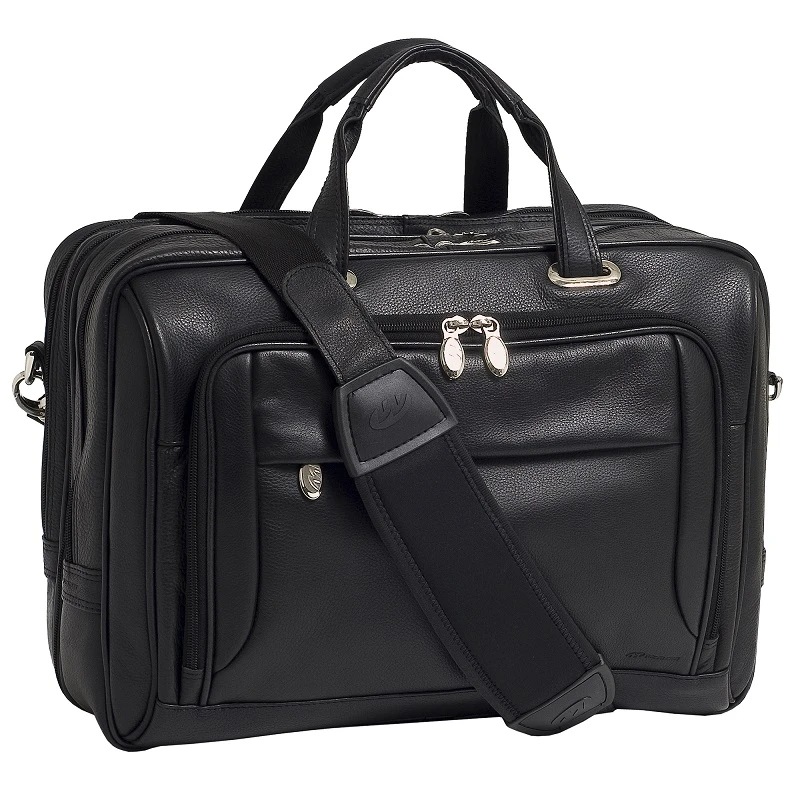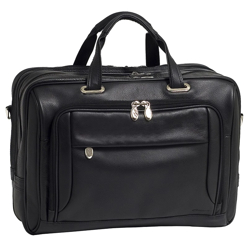 You’ll enjoy the great value and design of the McKlein leather expandable double compartment briefcase. It can be carried by men or women. It is made of a luxurious cashmere napa leather that is elegant and efficient. This McKlein I Series West Loop expandable double compartment leather briefcase offers function at your fingertips! Carry the briefcase in the slimmer style or expand the McKlein leather brief another two inches when you need to carry more. It is like having two briefcases in one! The very comfortable shock absorbing adjustable shoulder strap insures comfort or use the double carry leather handles! You can also securely slip it over the trolley handle of your rolling luggage to piggyback along on top. Shipping is FREE along with a FREE leather bag tag that we monogram exclusively for you with your initials.