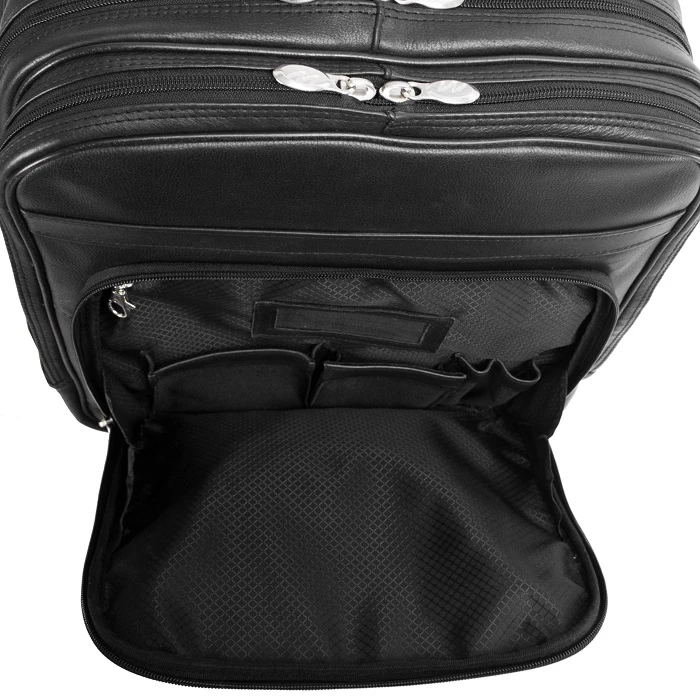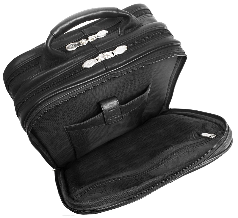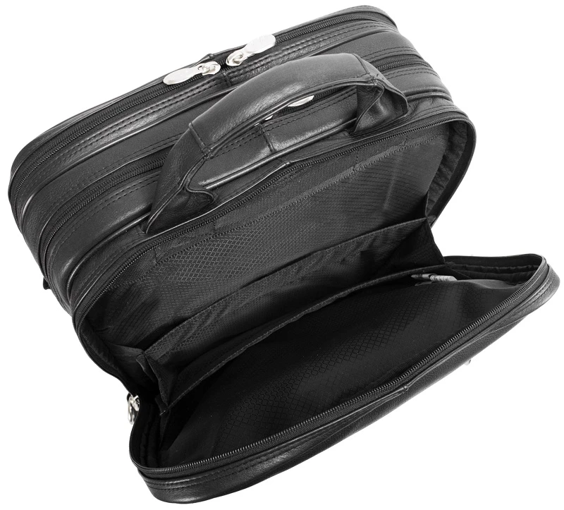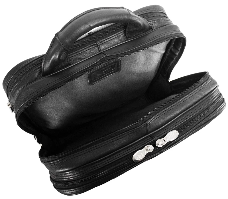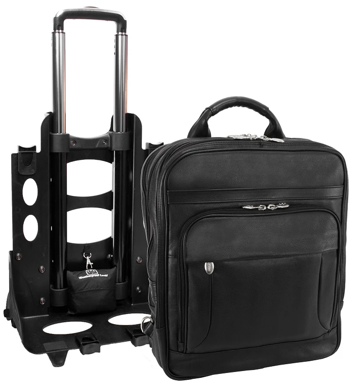 You’ll appreciate and enjoy the many features offered by this McKlein I Series leather detachable wheeled 3-way computer backpack briefcase! It is like getting three bags in one fabulous briefcase. Carry it as a briefcase on your back, use the top leather carry handle as a regular brief, or attach the wheels and easily roll along. This McKlein leather brief has all of the efficient pockets and compartments to keep you well organized too. Made of full grain Napa leather, it is luxurious and always makes the right impression. This McKlein leather briefcase is also light in weight for easy carrying. We include FREE shipping and a FREE leather bag tag with your initials monogrammed.