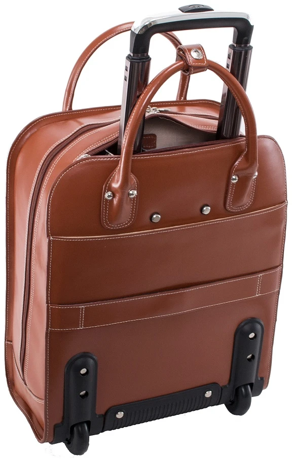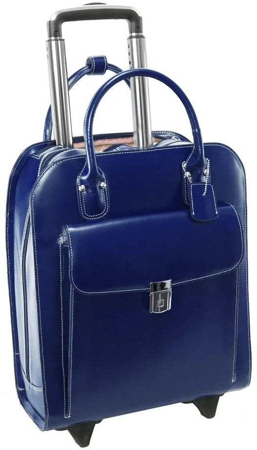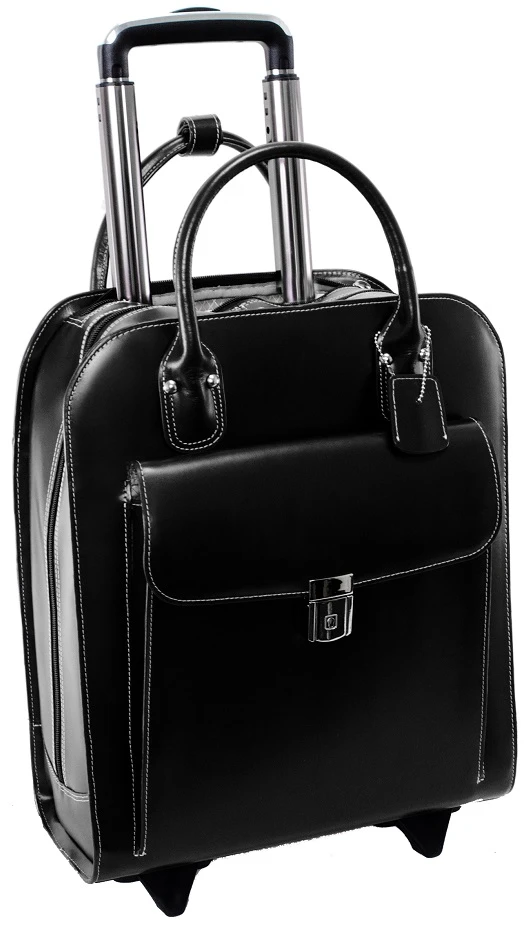 You’ll enjoy the modern features and fabulous design of the McKlein L series uptown wheeled ladies laptop brief. It easily rolls down aisles on inline skate wheels because of the slim profile. Efficiently carry this McKlein uptown wheeled brief by the double handles, use the easy rolling wheel system, or slip it over the trolley handle of your luggage securely. This is the brief for you! Made of elegant top grain leather, it is conveniently pocketed to keep everything in place. The McKlein uptown SALE wheeled brief even has a locking pocket on the outside of the case. We include a FREE leather bag tag monogrammed for you with your initials and shipping is FREE of charge!