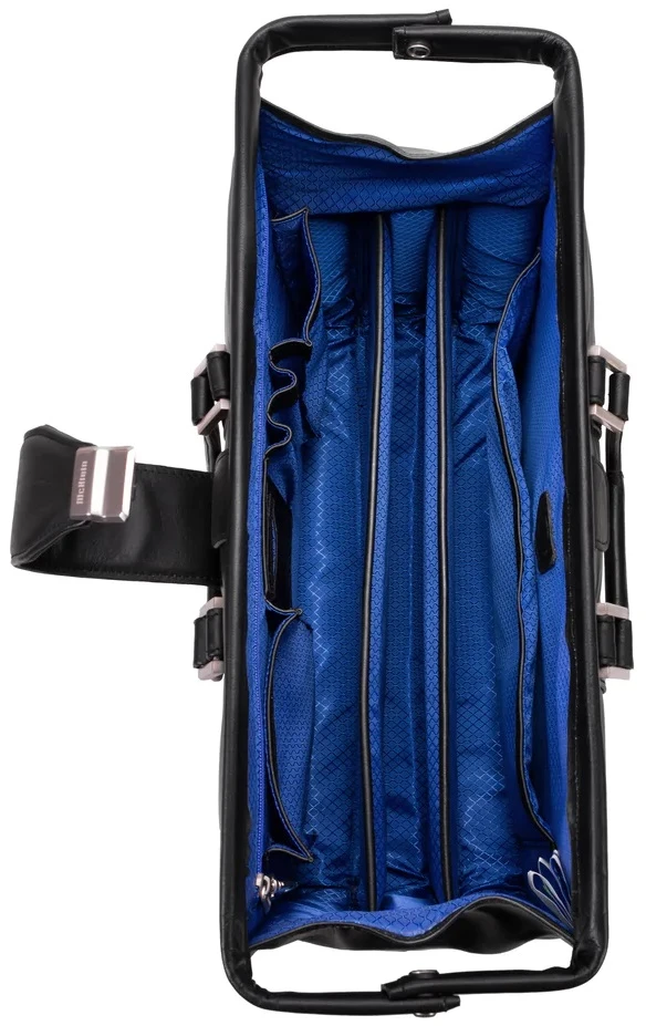 Enjoy the low SALE pricing on this McKlein leather litigation laptop briefcase. Carried by lawyers, accountants, and business executives who appreciate the convenience and elegance of leather, this brief is very functional. You can easily work out of the case as it stands upright easily. Made of oil tanned leather, this litigation case has a removable shoulder strap. You will appreciate the low pricing and quality of the McKlein V Series Morgan 17″ Litigator leather laptop brief! Everything stays securely inside the McKlein litigation laptop briefcase with the three dial combination lock. Shipping is FREE along with a FREE leather bag tag that we monogram for you.