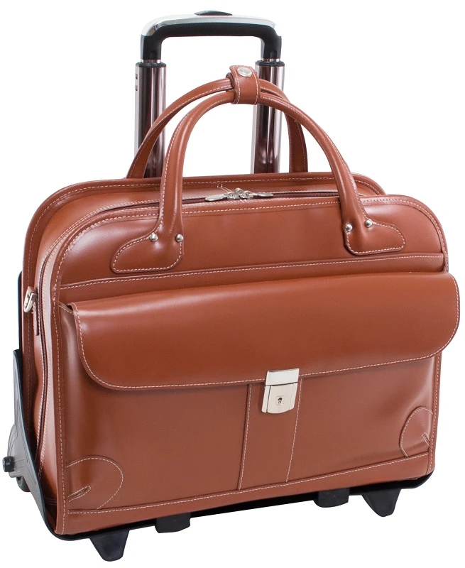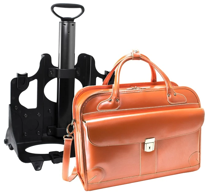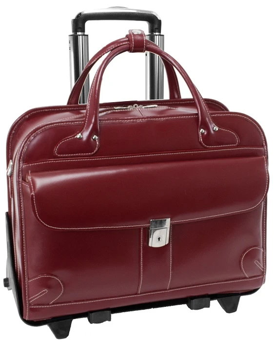 This leather briefcase from McKlein offers fabulous value and function! Enjoy fashion and color for your professional needs. You’ll want to use the McKlein W Series Lakewood detachable wheeled ladies briefcase at all of your important business functions. It can be used as a regular briefcase, or the wheels and trolley handle added when you need the convenience of being able to roll the briefcase along! You get two briefcases for the price of one. Available in fashion colors, this is the way to go! We include FREE shipping on this elegant, fabulous McKlein leather rolling briefcase. We also include a FREE leather bag tag with your own initials monogrammed!