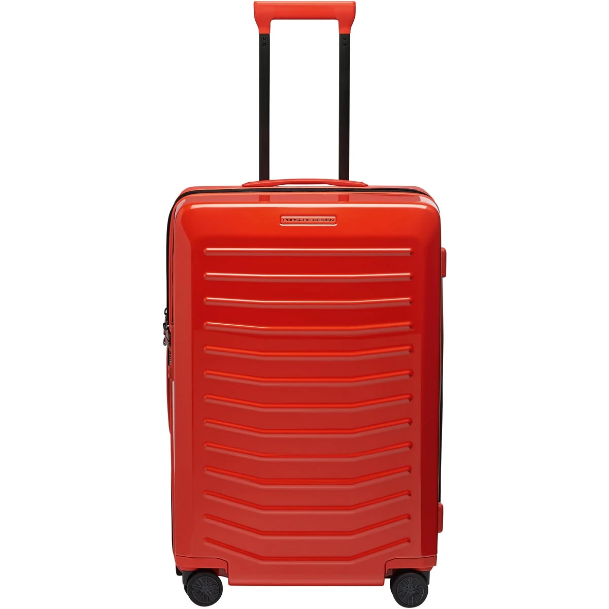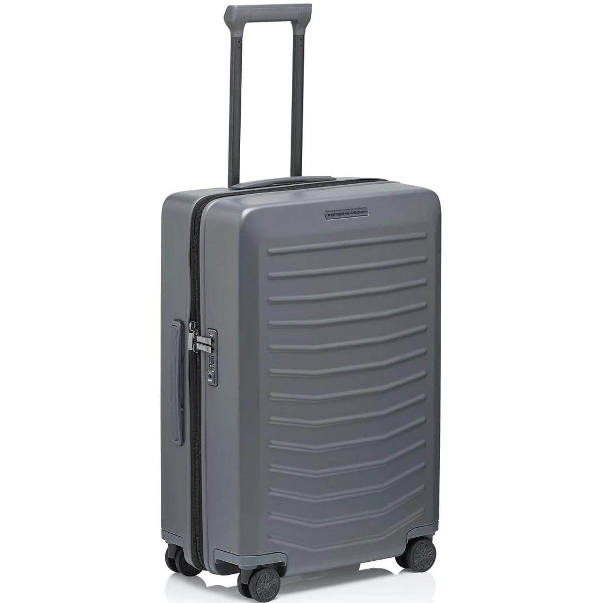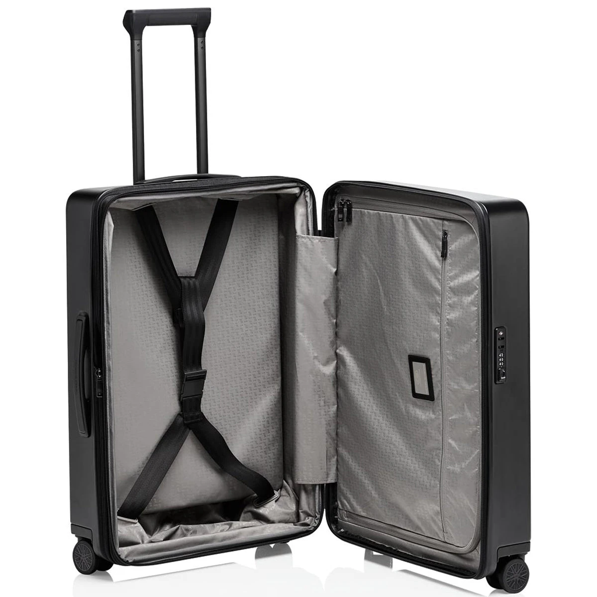 Ball bearing, smooth-rolling wheels in the style of Porsche Taycan rims and a multi-step, ergonomic handle provide for the perfect performance. Through the rounded edges of the handle, bags can be easily attached and removed. The divided interior is also flexible – and can be expanded at any time. An ultra-secure two-way zipper and a TSA lock protect your luggage.