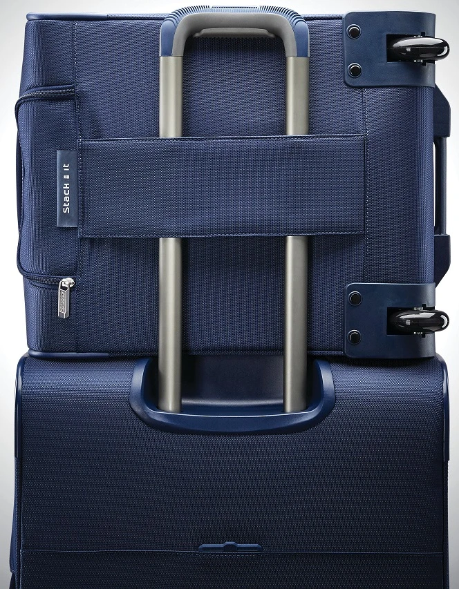 - Stack-It sleeve slides over upright suitcase handle for easy mobility