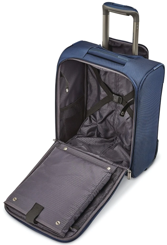 Pack up the Samsonite Insignis underseater wheeled carry on luggage when you want to be sure to take the bag on board as the smaller size will almost always fit! It has all of the features you want with a stack-it sleeve to slide over the trolley handle of your larger pieces. The Samsonite Insignis underseater wheeled carry on includes a laptop/tablet sleeve plus a USB port to charge your devices while on the go (use your own battery pack.) The well designed Samsonite Insignis underseater wheeled carry on can also double as a rolling business case. Made of durable polyester that is dirt, oil, water and abrasion resistant, plan to travel often and well with the Samsonite Insignis underseater wheeled carry on luggage! We include FREE shipping and a FREE leather luggage tag monogrammed with your initials for easy identification wherever you go.