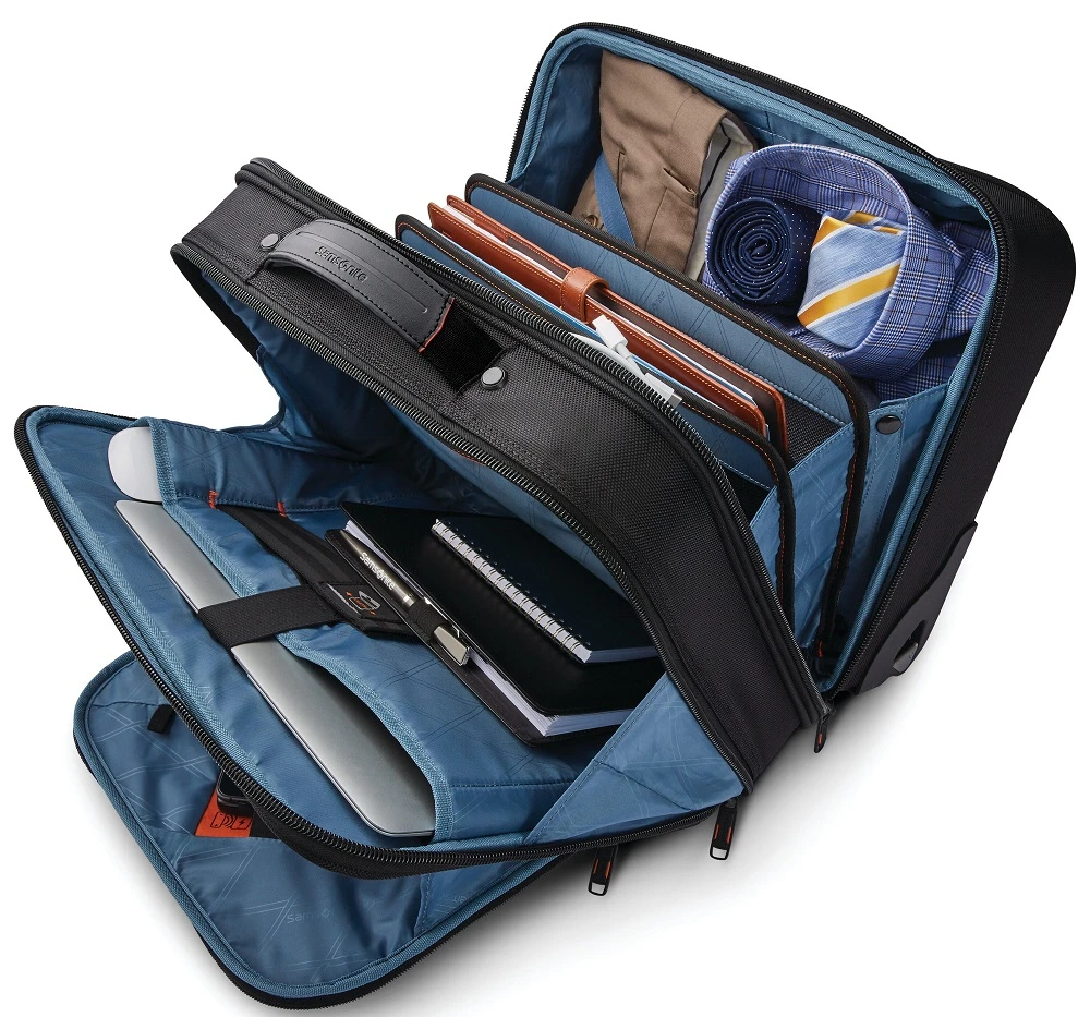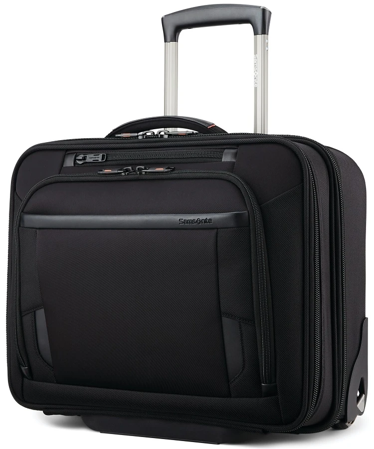 Why carry when you can roll your briefcase? The Samsonite Pro Mobile Office carries all of your business needs and is well organized. You can roll the Samsonite Pro Mobile office along, carry by the top handle, or slide it over the trolley handle of your other rolling luggage. It is made for your carrying ease. The Samsonite Pro mobile office is durable and made of 1262 Denier Nylon that is abrasion, dirt, oil and water resistant! This is the way to attend important business meetings in style with the Samsonite Pro mobile office! Shipping and a leather luggage tag monogrammed with your initials are FREE of charge! The monogrammed leather tag means everyone will know this efficient Samsonite Pro mobile office is yours!