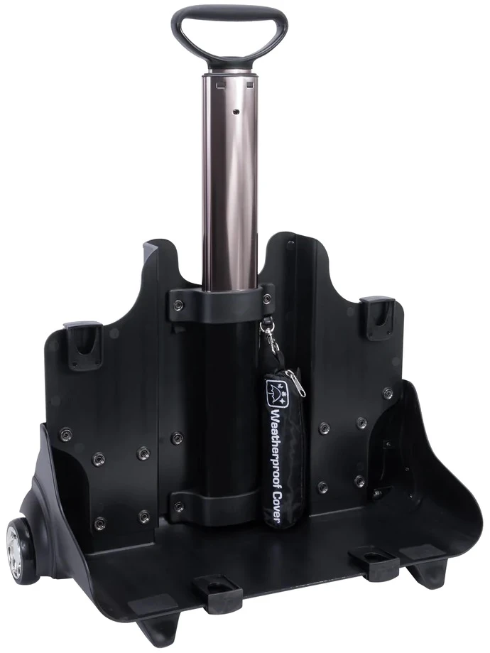- Strap on rear of bag, so when bag is detached from wheel system, it can still piggyback on an upright luggage handle