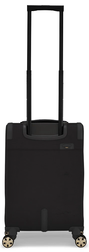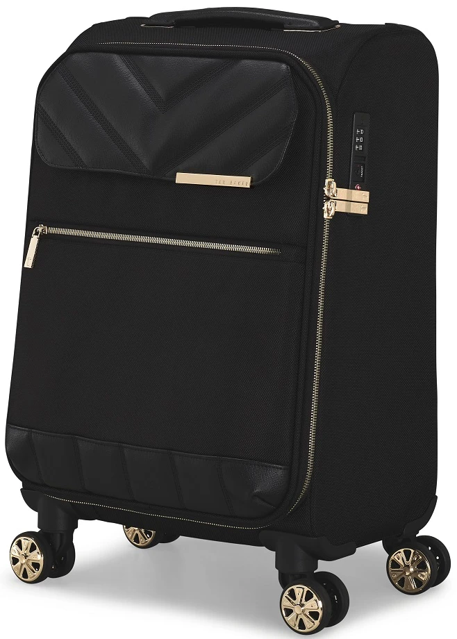 With elegant simplicity you will travel often and well with the Ted Baker Albany Eco small spinner luggage! Sized to bring on board most domestic and international flights, it will also glide down the aisle of planes and trains. You can easily roll it beside you when waiting on those slow-moving lines too. The Ted Baker Eco small spinner luggage has two exterior zippered pockets for your essentials. Made of polyester from recycled bottles, the Ted Baker albany Eco small spinner carry on luggage has brass trim, Bespoke spinner wheels, and Saffiano leather trim. It is truly elegant and designed to stand out in the crowd. We include FREE shipping and a FREE leather tag monogrammed in gold with your initials so everyone will know the Ted Baker Albany Eco small spinner carry on luggage is yours!