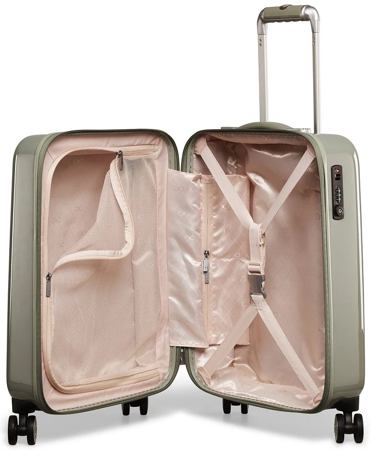 Bring an elegant touch along with you on quick trips and travel well with the Ted Baker Sage small hardside spinner luggage. Designed to take on board most domestic and international flights, the Ted Baker Sage small hardside spinner luggage is truly lightweight at less than five and a half pounds. The fully lined interior is beautiful and easy to pack with the handy pockets. The high gloss finish on the Ted Baker Sage small hardside spinner luggage keeps it scratch resistant and the luxurious Bespoke goldtone hardware truly catch your attention. With the dual spinner wheels, you can glide the Ted Baker Sage small hardside spinner luggage along beside you as you wait on slow moving lines or as your rush to your destination. It will also roll smoothly down the aisle of planes and trains. We include FREE shipping and a FREE leather luggage tag monogrammed with your initials for quick identification of your Ted Baker Sage small hardside spinner wherever your journey.