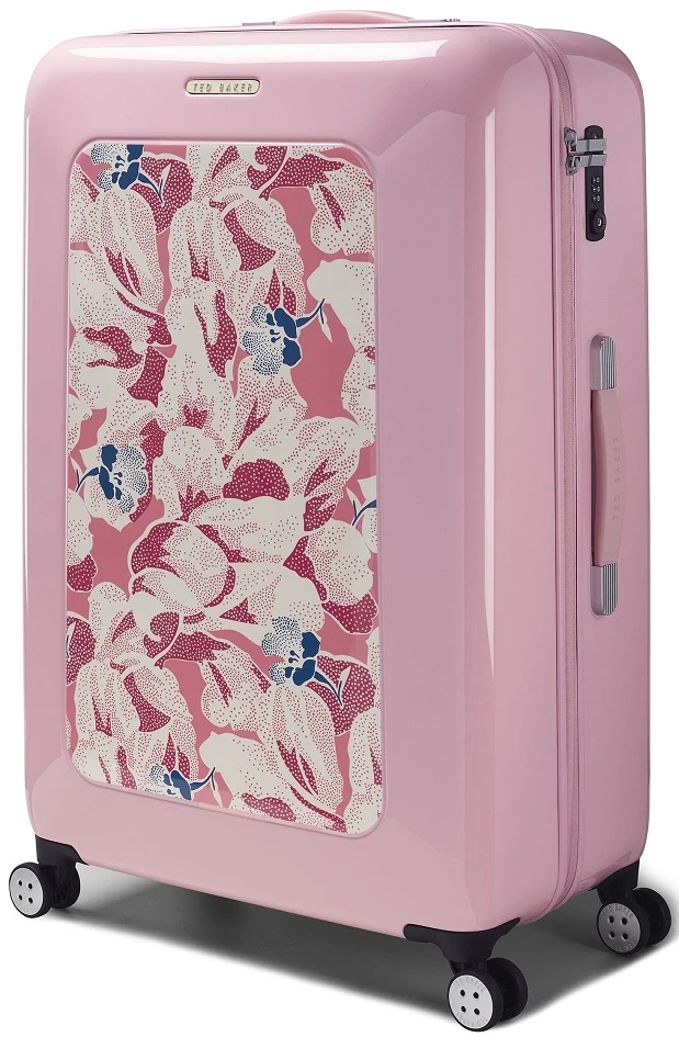The joyful design of the Ted Baker Take Flight New Romance large hardside spinner luggage makes it ideal for long trips and cruises. It has a built-in TSA approved combination lock and dual spinner wheels for rolling ease. You can walk along with the Ted Baker luggage Take Flight new romance large hardside spinner gliding beside you. This is the way to travel! It is lightweight and scratch resistant, and has a fully lined interior. The Ted Baker luggage Take Flight new romance large hardside spinner includes a clear water resistant clear cover to keep your bag always fresh and new looking. Packing and unpacking is easy with the divided interior that has an organizer for smaller items. We include FREE shipping and a FREE leather tag monogrammed with your initials for quick and easy identification of your lovely Ted Baker luggage Take Flight New romance large hardside spinner.