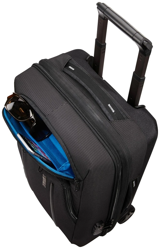 Inspired style and design is apparent in the Thule Crossover 2 expandable carry on luggage! Built to bring on board most domestic and international flights, it is lightweight and built to travel. Made of water resistant nylon, the Thule Crossover 2 expandable carry on luggage has over-sized all terrain wheels that easily handle bumps and curbs along the way. A very efficient SafeZone pocket protects your eye glasses and small electronics! The Thule Crossover 2 carry on luggage has a convenient outside zippered pocket for your travel essentials! We include FREE shipping and a FREE leather luggage tag monogrammed with your initials for easy identification of your fantastic Thule Crossover 2 carry on wherever you travel!