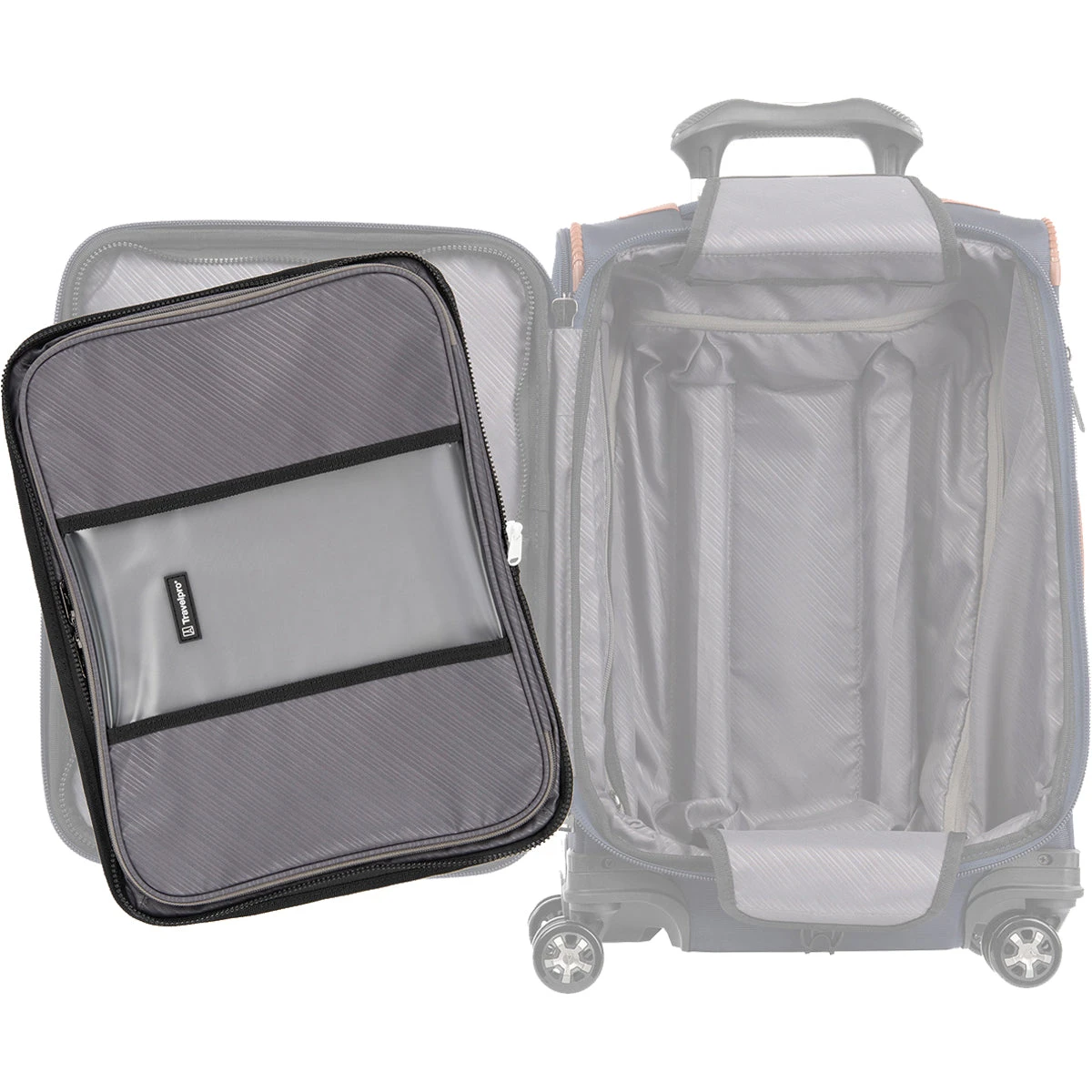 - Easily zips onto the internal lid of the coordinating carry-on bag using the white zipper pull