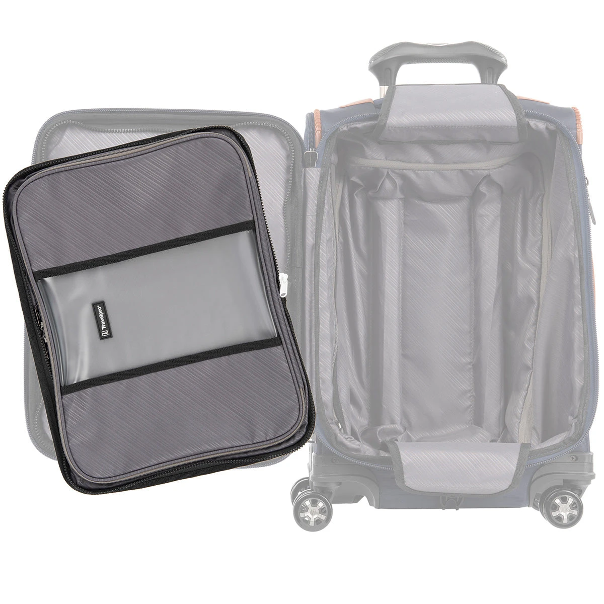 - Easily zips onto the internal lid of the coordinating carry-on bag using the white zipper pull