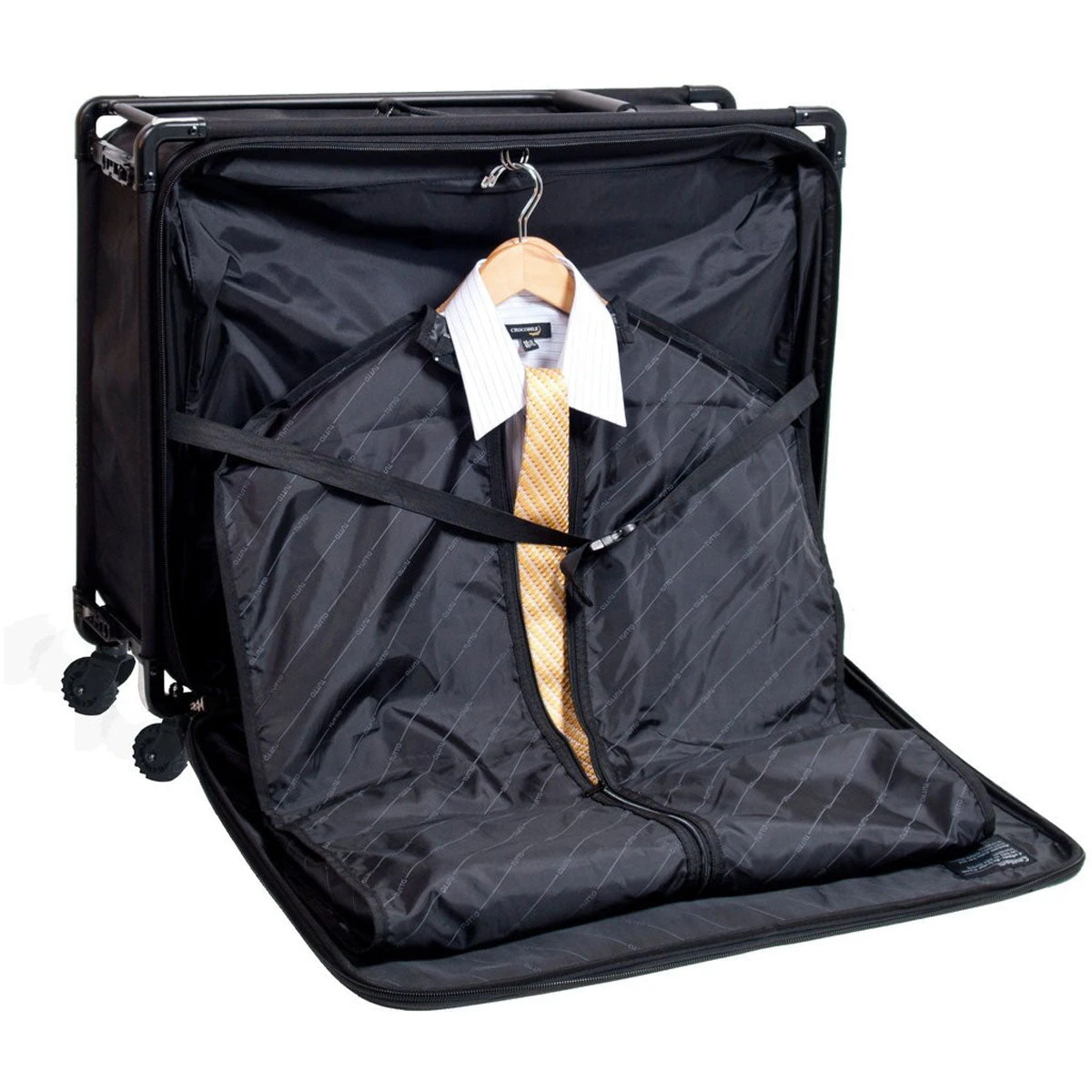 - A fold out side panel can hold several suits rigidly so they don’t get wrinkled.